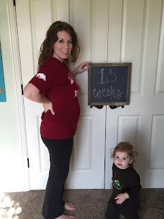 Well, I guess I'm on a roll of only blogging every other week. Sorry little baby. I guess it's just harder for me when I switch over on Saturday instead of one day during the week. However, here we are at 15 weeks! I have really noticed a difference in how I have been feeling---I have little to no nausea, my energy is coming back, and I feel like my mood is improving too. It's a win-win! I have even started getting back in the swing of things around the house---actually doing laundry and grocery shopping and picking up and cleaning and cooking! It's nice to start feeling more like myself.